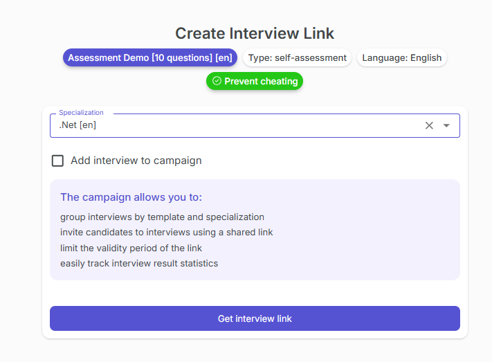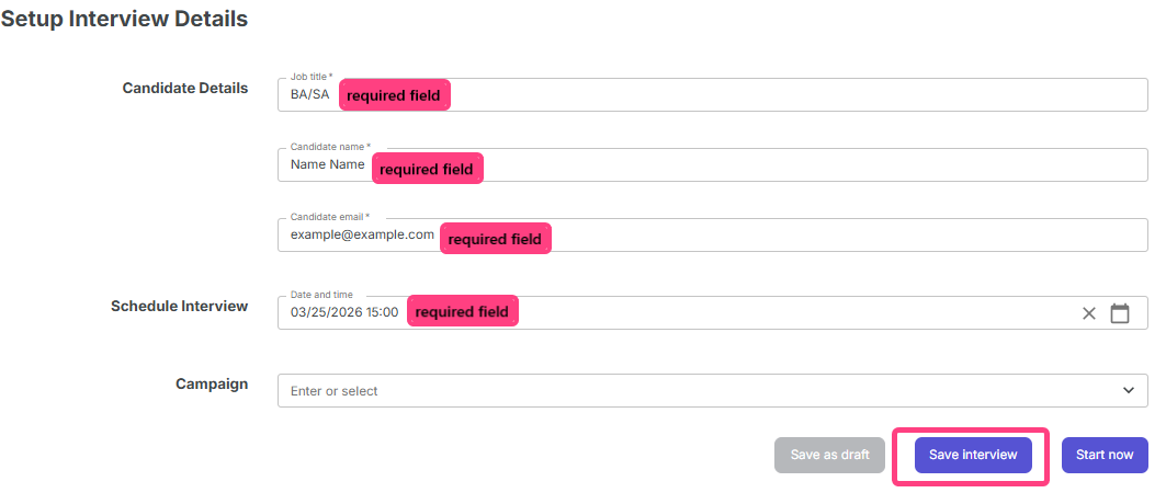 - Campaign, if you want to link the interview to an existing campaign or create a new one.