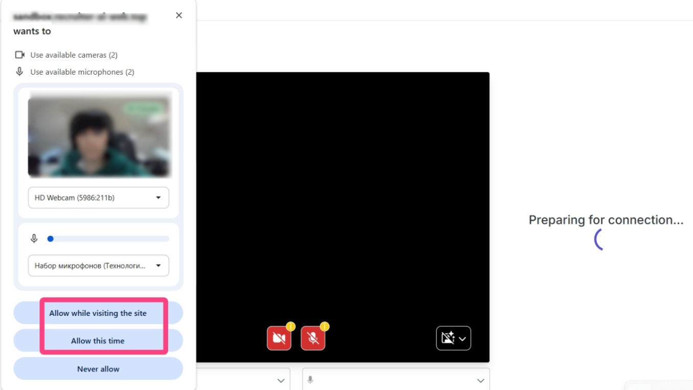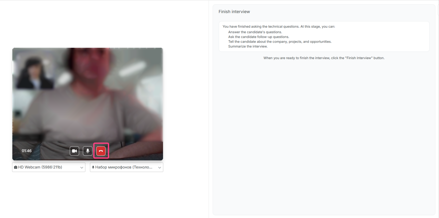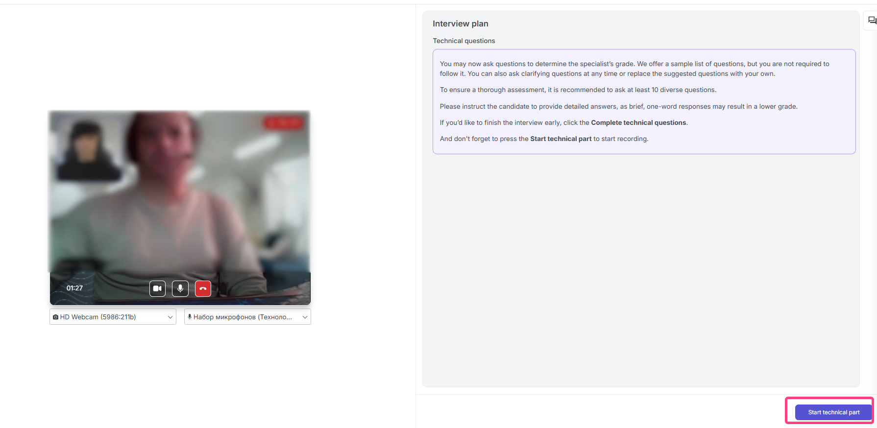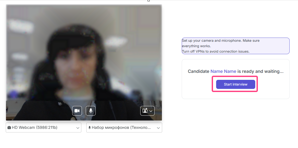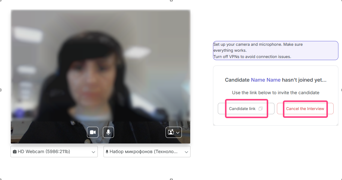 Before starting the interview, make sure the camera, microphone, and headphones are working properly, and that the candidate has already received their link.