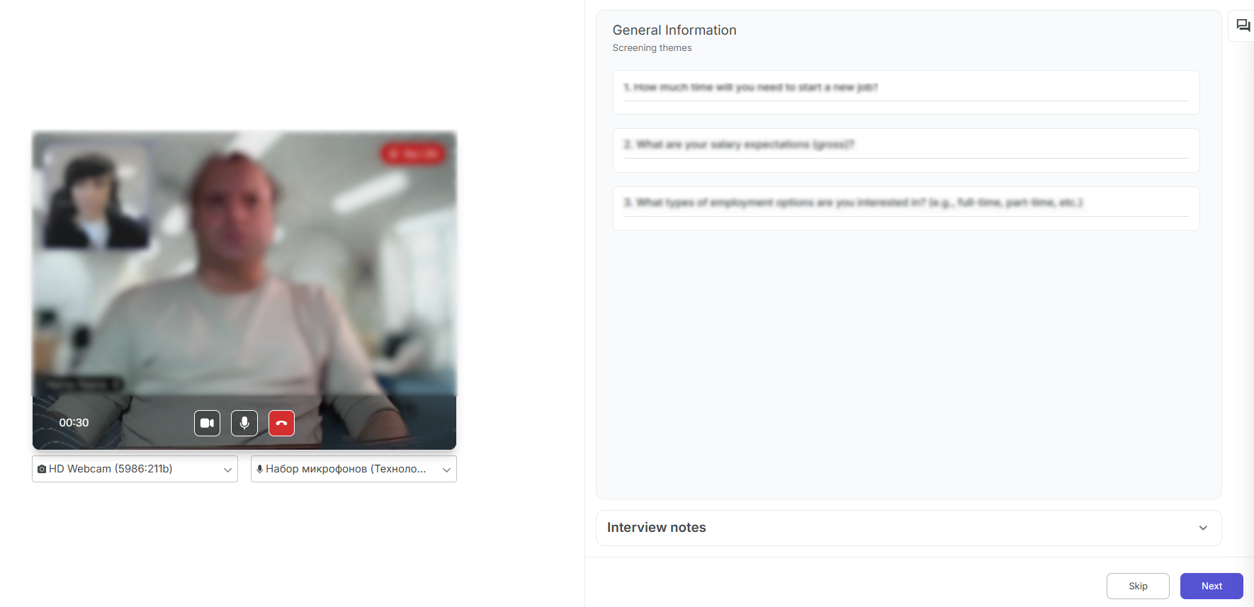 After the interview starts, an interface with the Interview plan will open. It contains discussion topics such as General Information, Experience, Motivation, and others. Topics can be covered in any convenient order and marked as completed as you go.