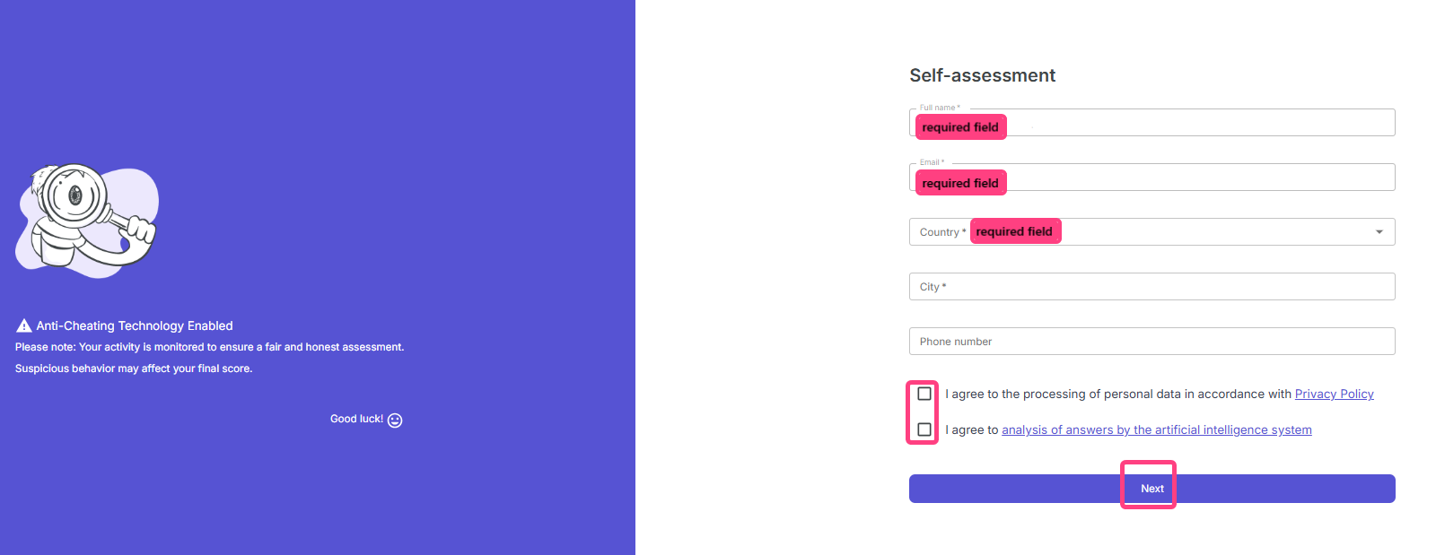 - Enter your details. On the page that opens, fill in your full name, email address for receiving the results, and phone number. Review the consent options and tick the boxes to agree to personal data processing and AI-based answer analysis. Then click Next.