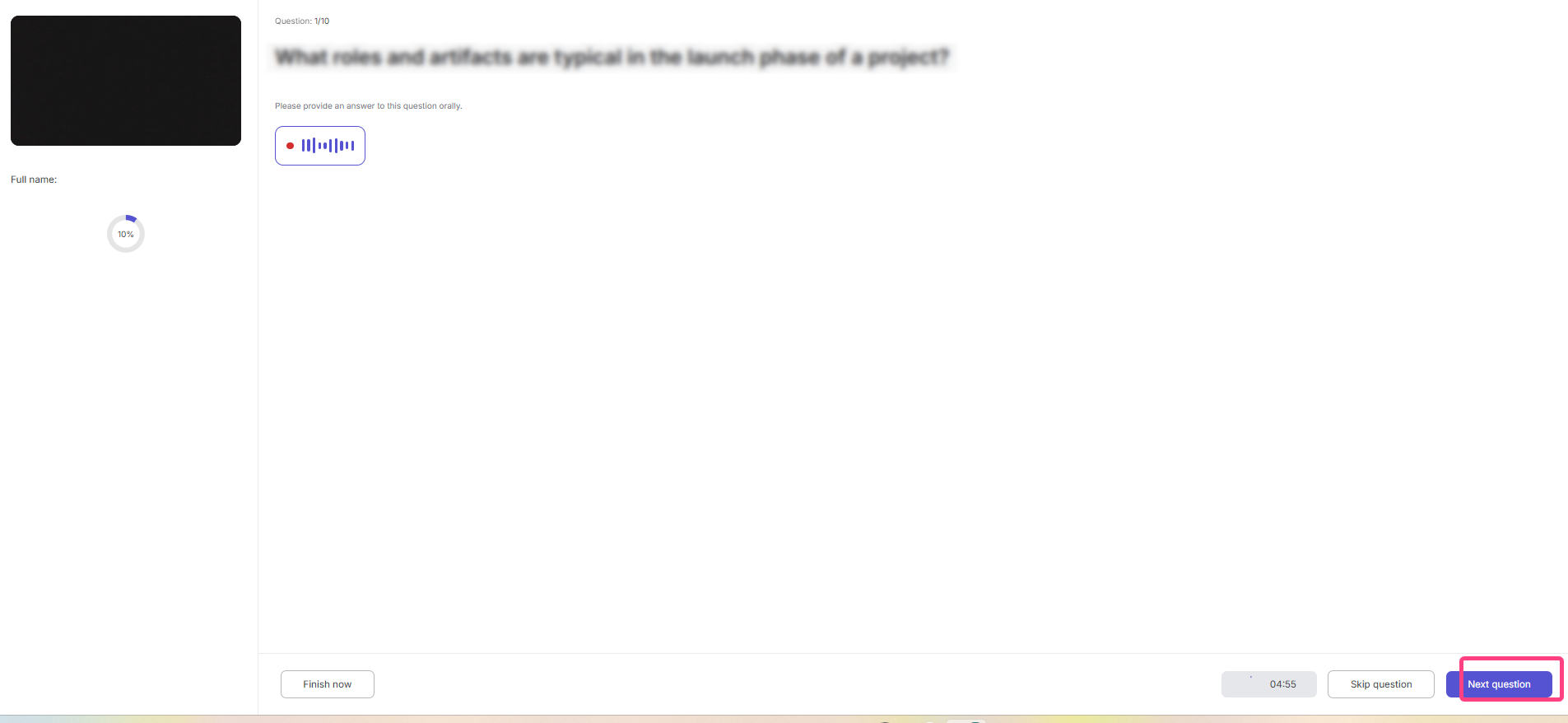 - Complete the test. The interface will show questions for the selected specialization, a progress indicator such as “Question 1/10”, and an answer timer. Each question requires a detailed spoken answer. To move to the next question, click Next question. On the last question, the button will change to Finish test.