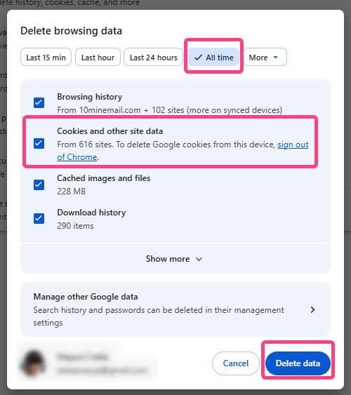 - Cookies and other site data