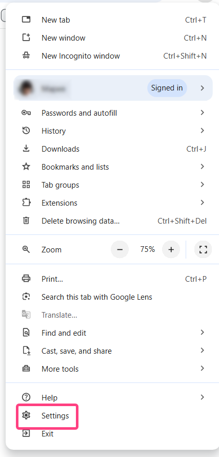 - In the upper-right corner, click the three-dot icon, menu, and select Settings.