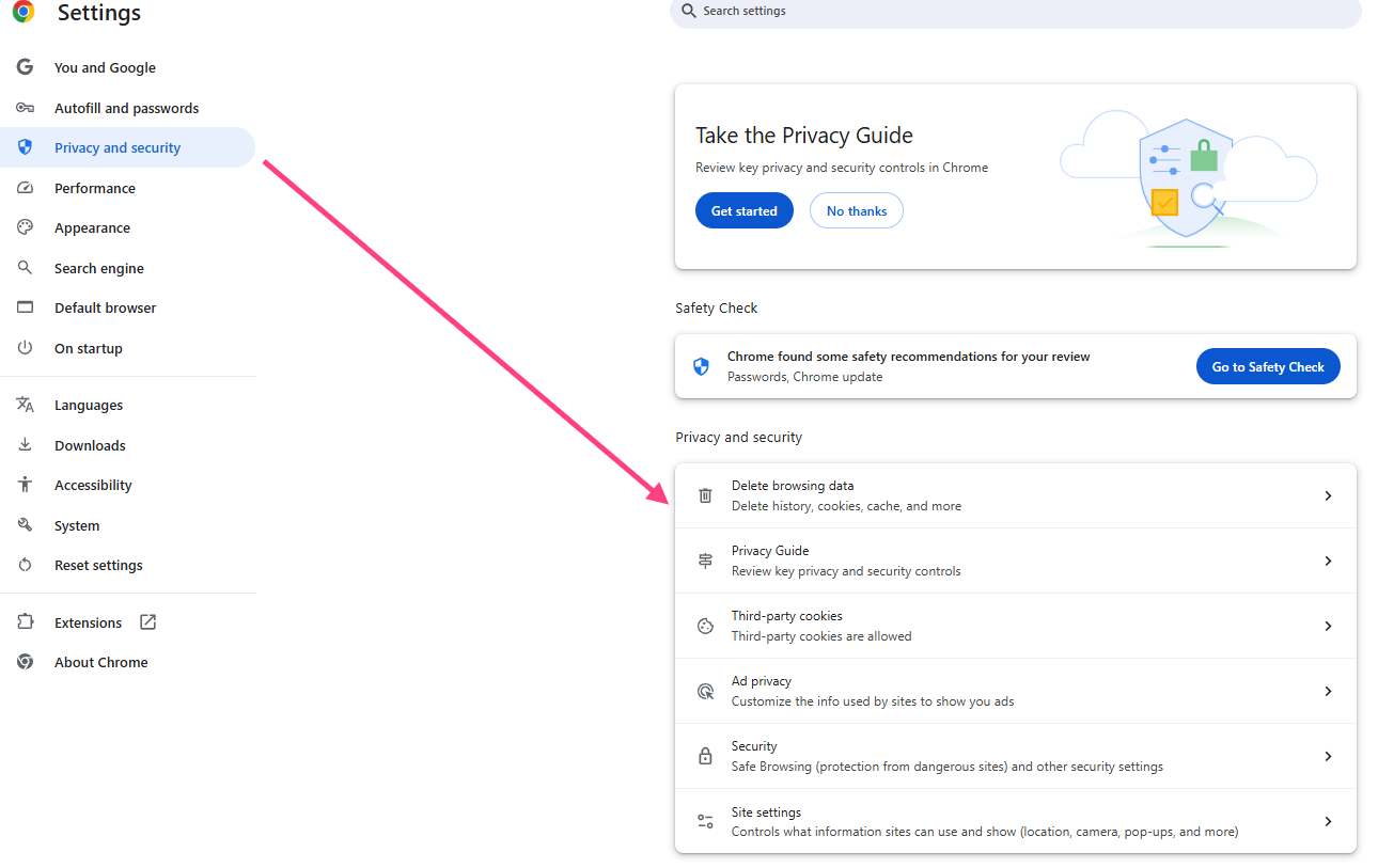 - In the left menu, select Privacy and security.