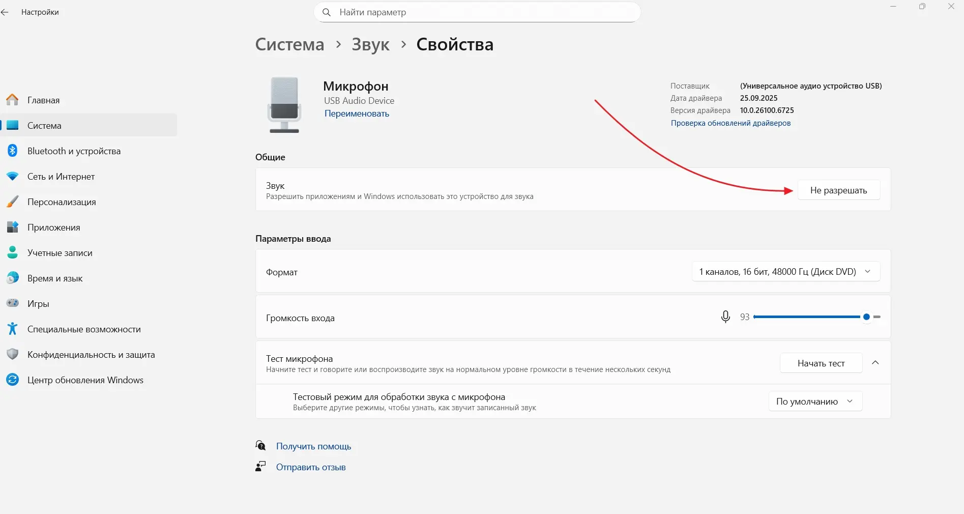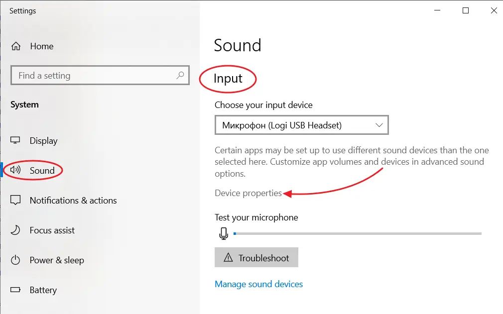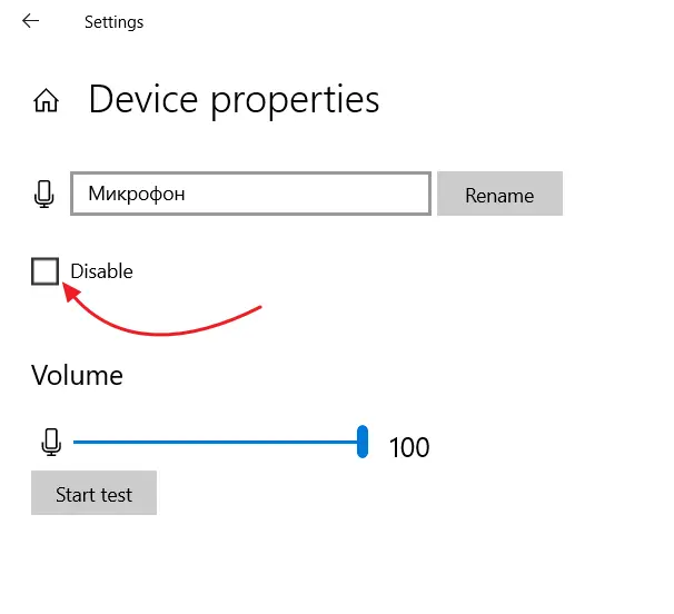 Inputsection, select the required microphone, if there are several, and clickDevice properties. TheDisableoption must stay unchecked.