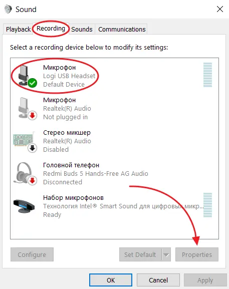 Recordingtab, select the microphone and clickProperties.