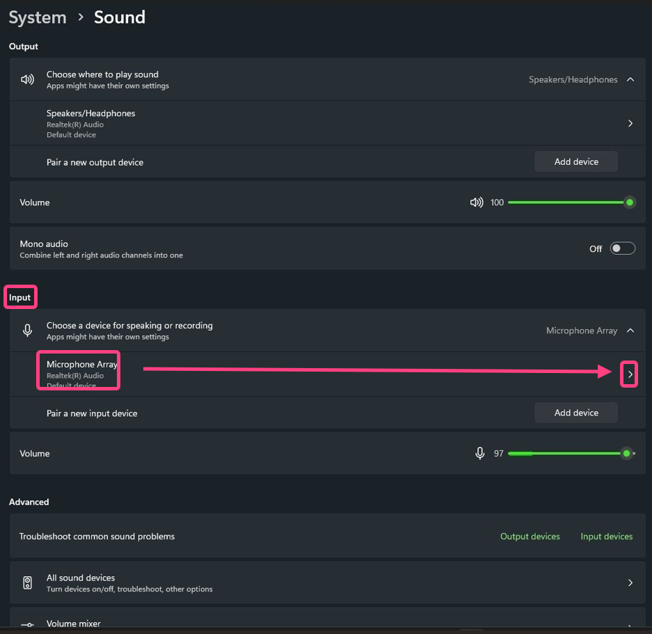 - In the input settings, set the input volume to the maximum value.