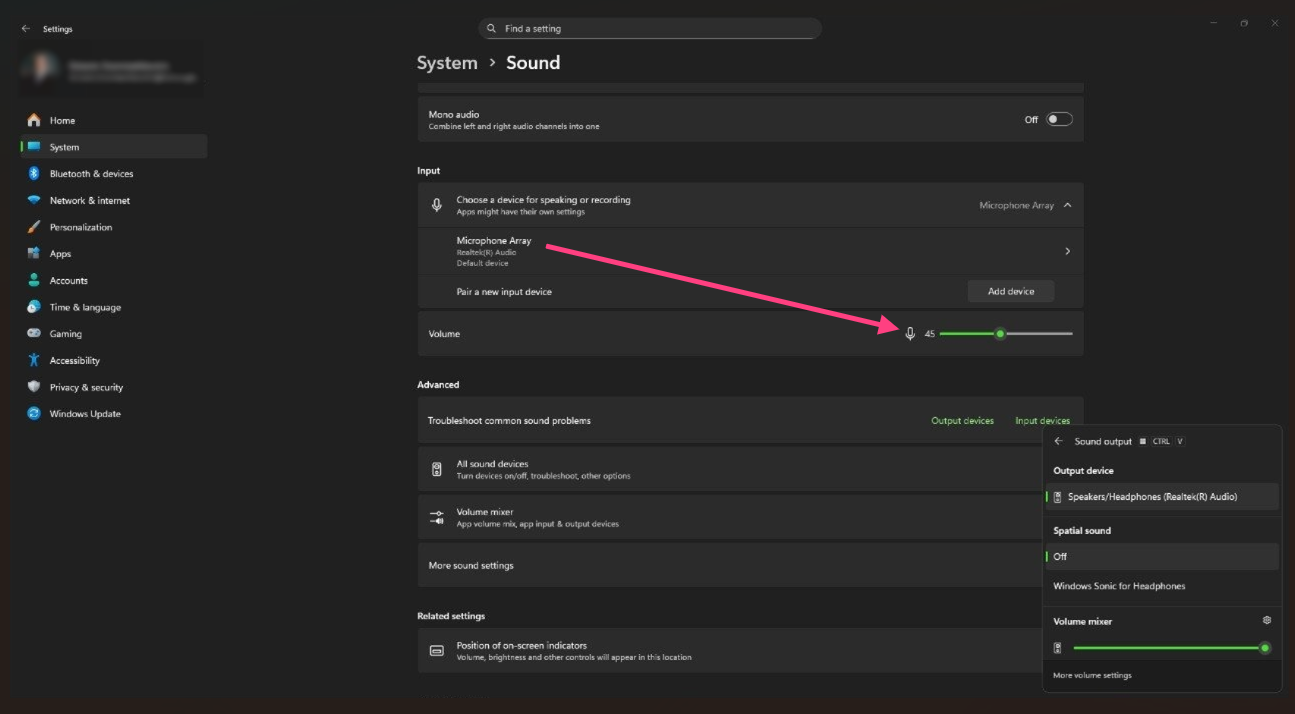 Start→Settings→System→Sound.