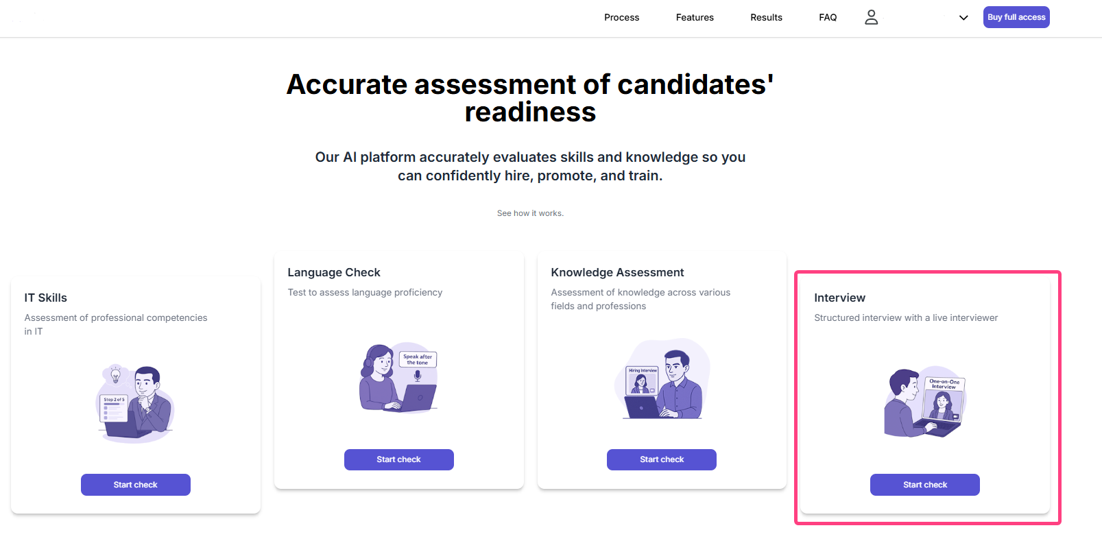 - Wait until the candidate joins the session. The status will change to “Candidate ... is ready and waiting”, and the button will change to Start interview.