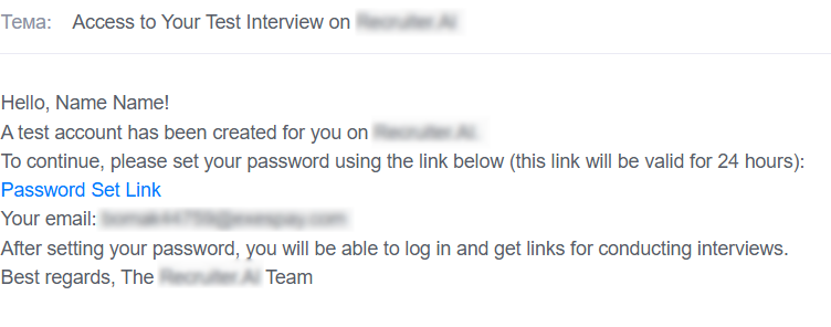 recruiter-ai@recruiter-ai.ruwith the subject “Access to your test interview on CompetenceIQ”. - Follow the link, create a password, and the system will sign you in automatically.