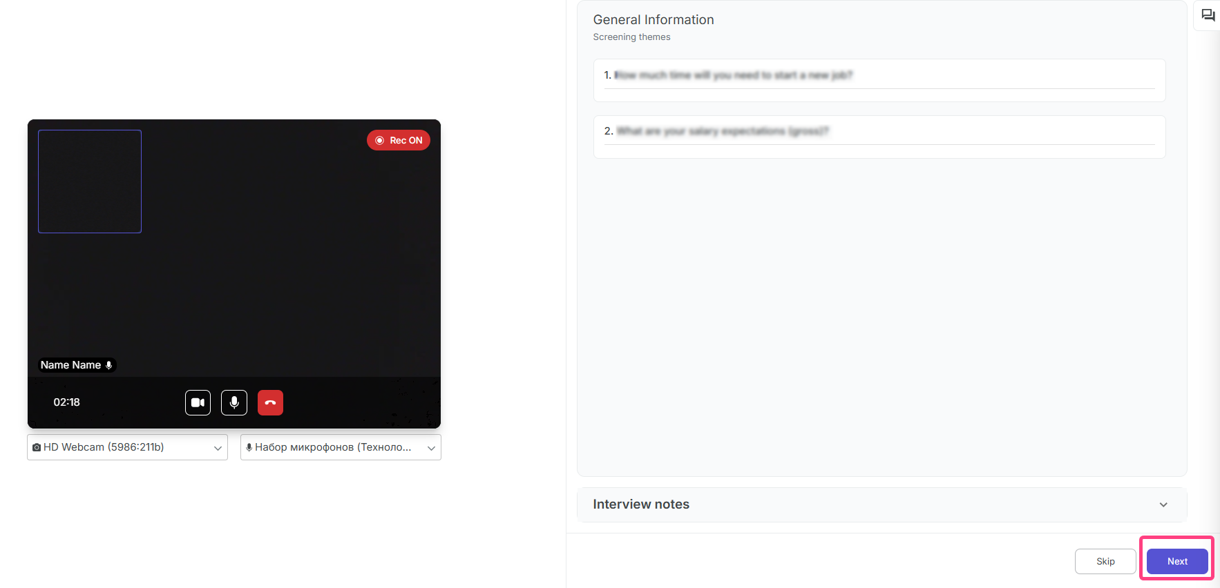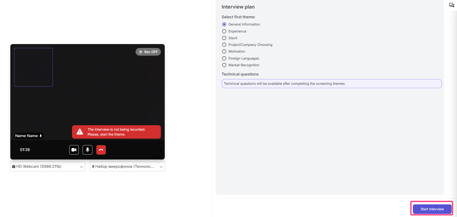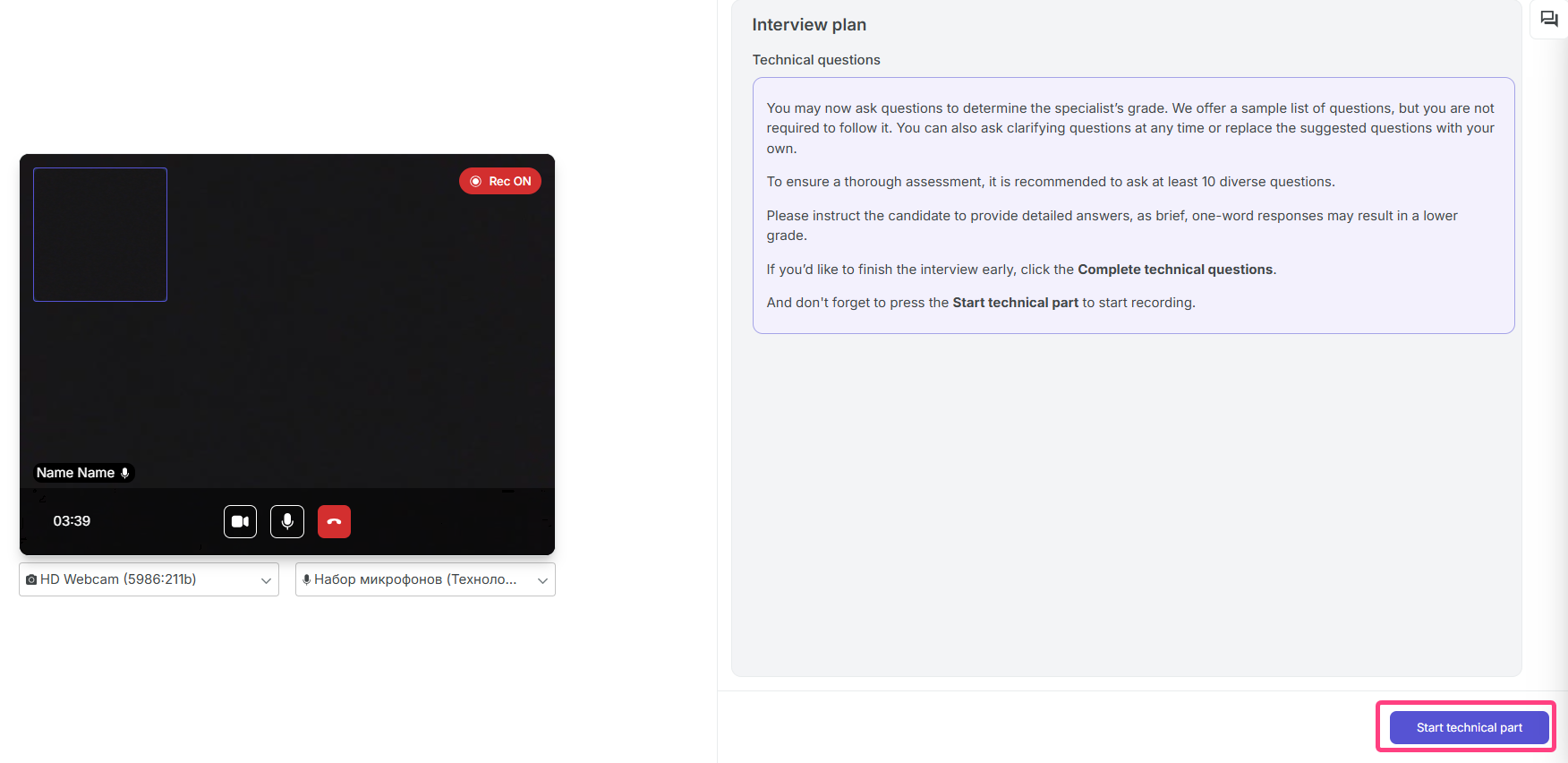 - After all technical questions are completed, the Finish interview stage will open. Here you can answer the candidate’s questions, talk about the company, and summarize the meeting.
