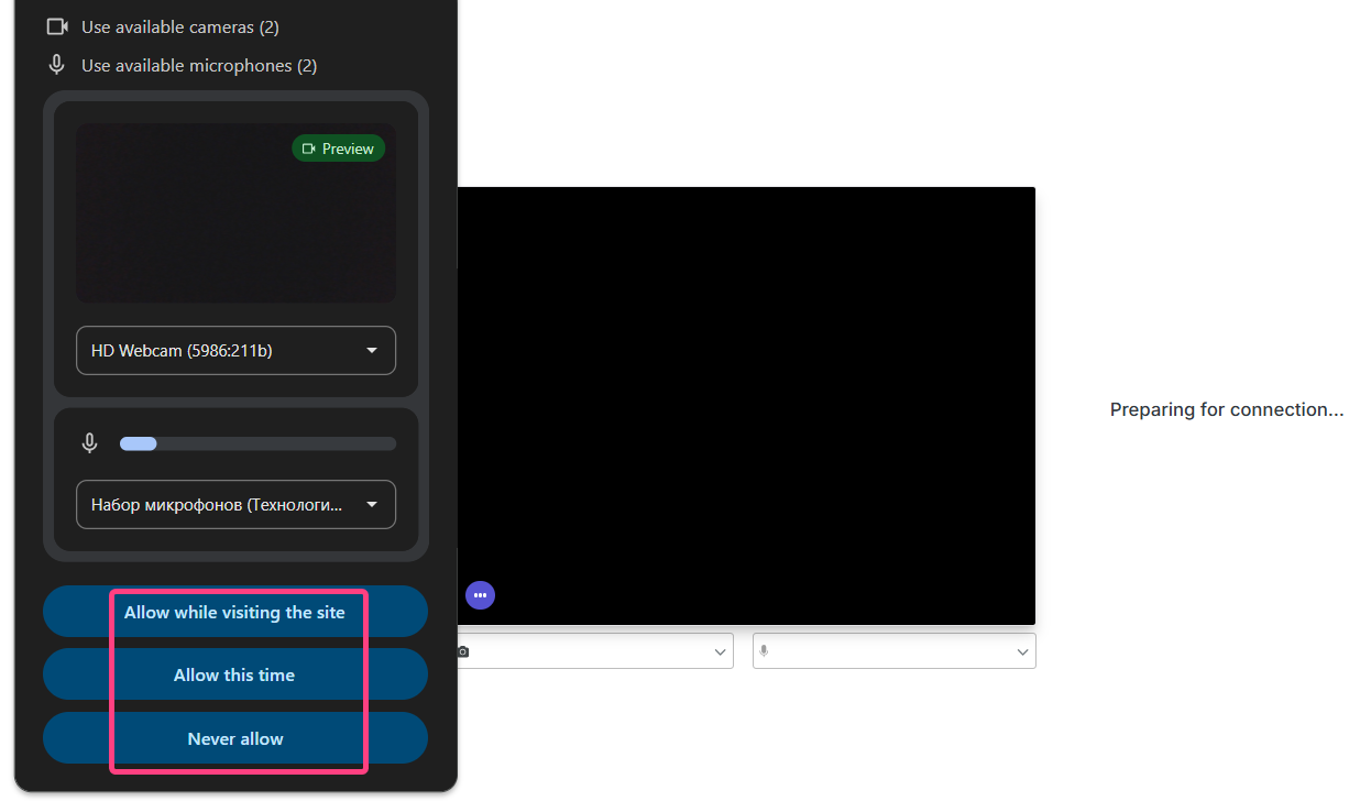 - The system will request access to the camera and microphone. Click Allow in the browser dialog.